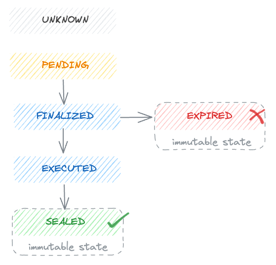- Sealed - The verification nodes have verified and agreed on the result of the transaction and the consensus node has included the seal in the latest block.