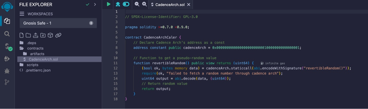 _17// SPDX-License-Identifier: GPL-3.0_17pragma solidity >=0.7.0 <0.9.0;_17_17contract CadenceArchCaller {_17 // Address of the Cadence Arch contract_17 address constant public cadenceArch = 0x0000000000000000000000010000000000000001;_17_17 // Function to fetch a pseudo-random value_17 function revertibleRandom() public view returns (uint64) {_17 // Static call to the Cadence Arch contract's revertibleRandom function_17 (bool ok, bytes memory data) = cadenceArch.staticcall(abi.encodeWithSignature("revertibleRandom()"));_17 require(ok, "Failed to fetch a random number through Cadence Arch");_17 uint64 output = abi.decode(data, (uint64));_17 // Return the random value_17 return output;_17 }_17}